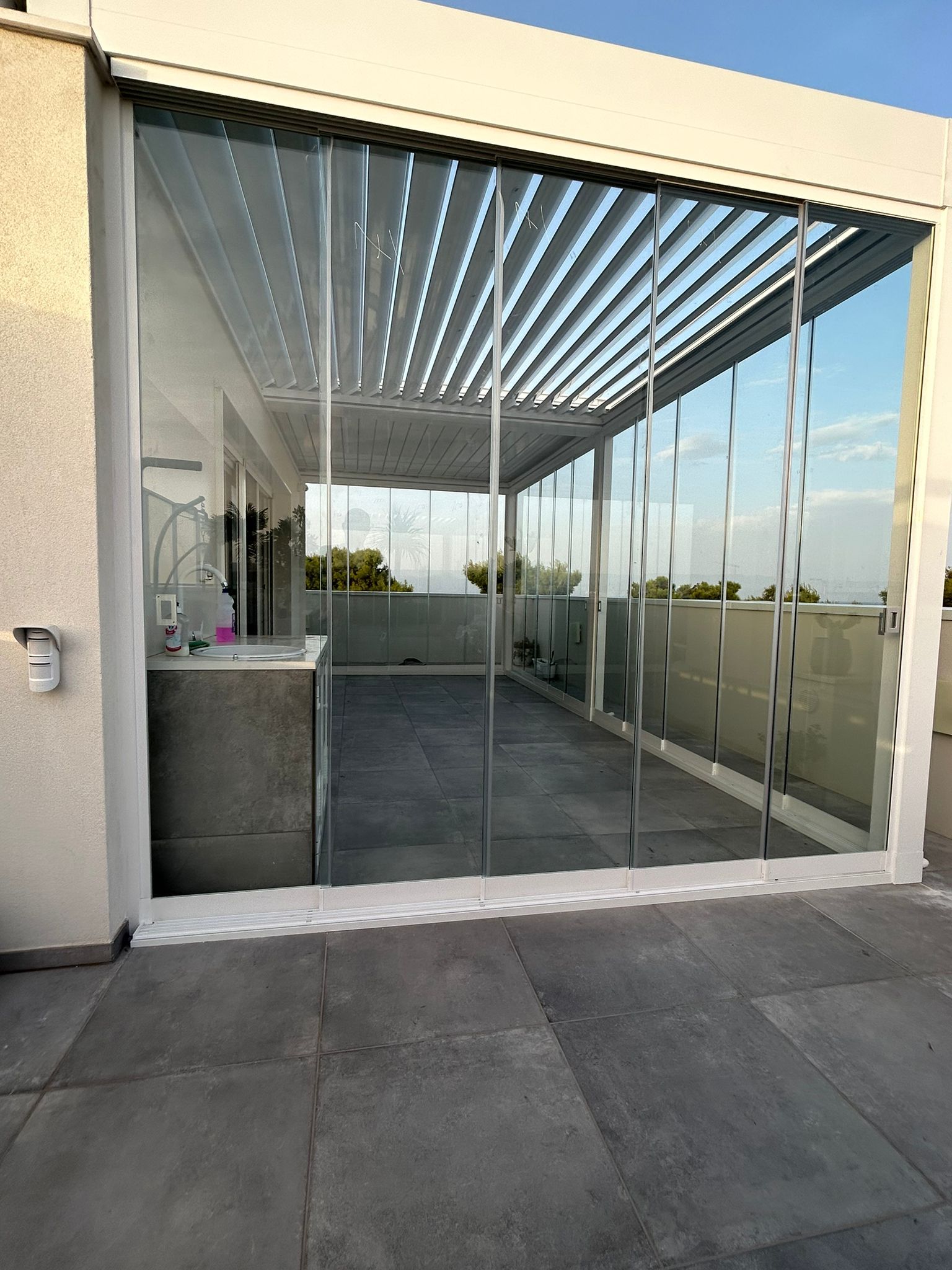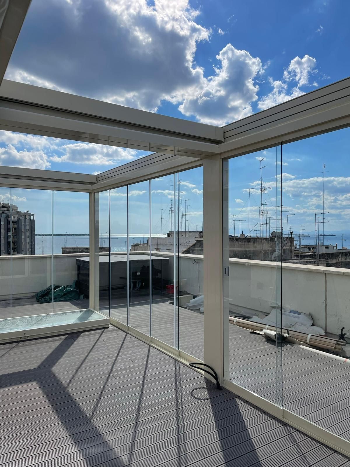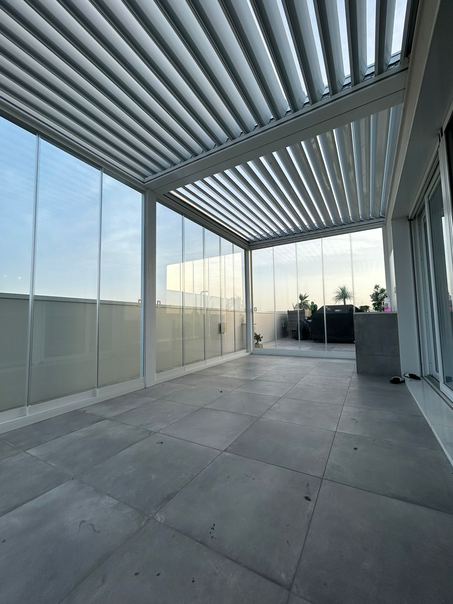 Il punto di forza delle nostre pergole bioclimatiche è la tecnologia delle lamelle orientabili, che consente una gestione personalizzata della luce solare e della ventilazione naturale. Questo sistema permette di creare ambienti esterni protetti dalla pioggia o dal sole diretto, mantenendo sempre un ottimo livello di comfort. A completare l’eleganza delle strutture, offriamo vetrate panoramiche scorrevoli o impacchettabili, perfette per chi desidera una continuità visiva con l’ambiente esterno senza rinunciare alla protezione dagli agenti atmosferici. Le vetrate panoramiche non solo aumentano la luminosità e la trasparenza degli spazi, ma rappresentano anche una soluzione efficace per migliorare l’isolamento termico e acustico, valorizzando ogni tipo di ambiente all’aperto.
